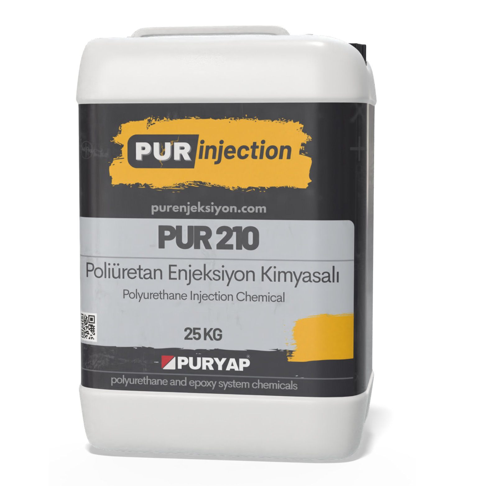 PUR 210 Tek Bileşenli katalizörsüz kullanıma hazırdır. Rijit poliüretan enjeksiyon reçinesi solventisz, ve kokusuzdur.Poliüretan su ile genleşerek, beton çatlaklarının ve çeşitli alanların su izolasyonunda kullanılır.